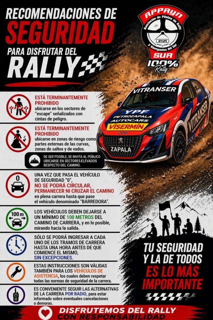 – Está terminantemente prohibido ubicarse en zonas de riesgo como partes externas de las curvas, zonas de saltos y de vados. De ser posible, se invita al público ubicarse en sectores elevados respecto del camino.