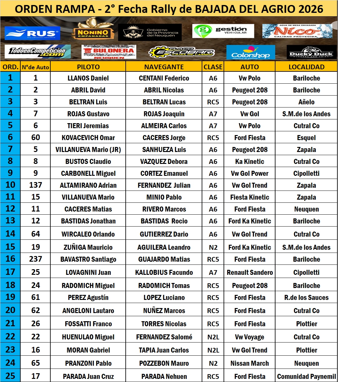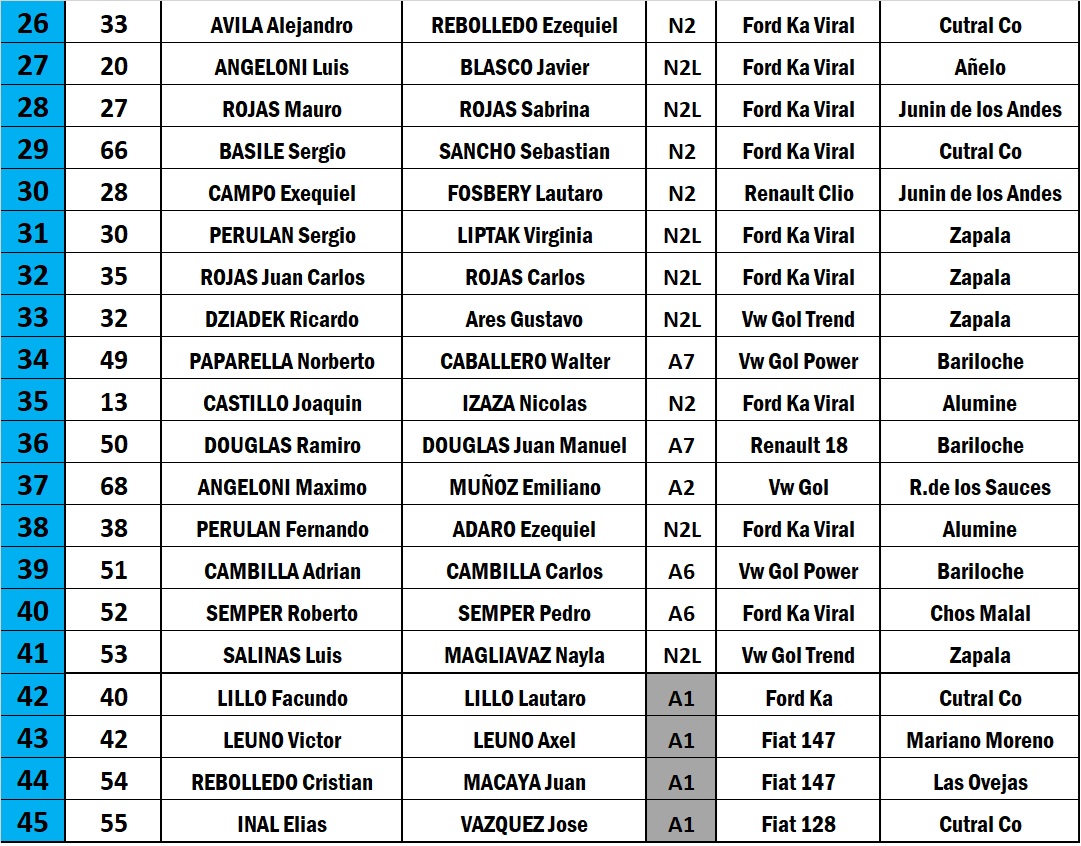 Los binomios que no sellaron fueron: Matto – Martínez (A2), Elfi – Castillo (A2), González – Jara (A6), Almeira – Castro (A7), Grassano – Solari (N2), Galvagni – Galvagni (N2) y Aguilera – Jerez (N2). De esta manera, tendremos 4 autos en la A1, uno en la A2, 12 en la A6, 5 en la A7, 6 en la N2, 9 en la N2L y 8 en la RC5.