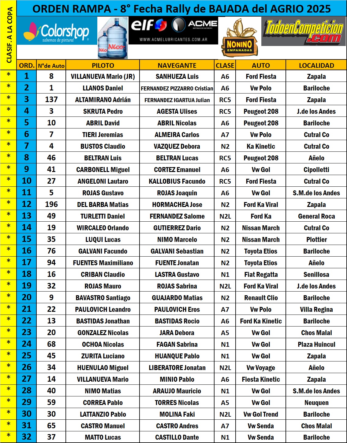 En horas de la tarde, se llevó a cabo en Bajada del Agrio la rampa de largada simbólica de la octava fecha del rally neuquino que organiza APPRyN Sur. Finalmente, son 66 los binomios que recorrerán los atractivos tramos en el centro de la Provincia.