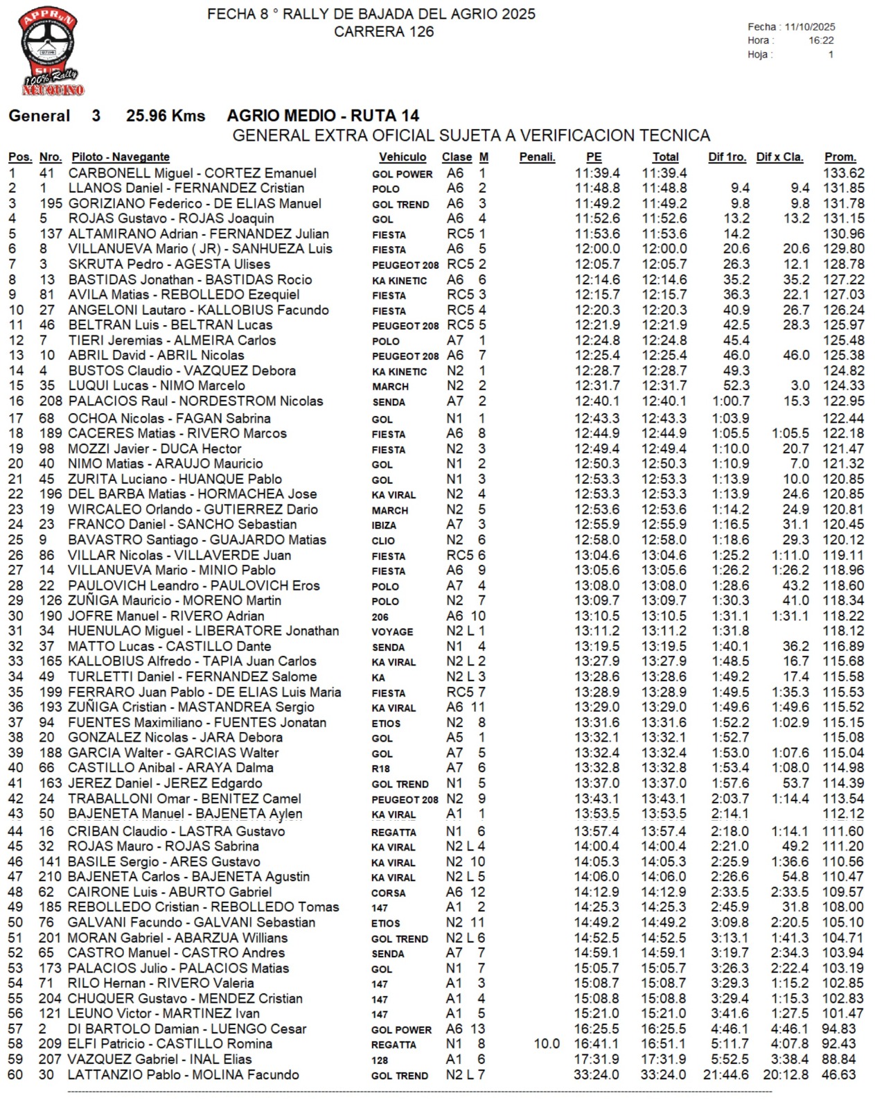 Por último, la A1 es dominada por Manuel y Aylen Bajeneta, con la diferencia más amplia del sábado: le llevan 31s8 a Cristian Rebolledo. El tercero, Hernán Rilo, está a 1m15s2. El clasificador se completa con Gustavo Chuquer y Víctor Leuno.
