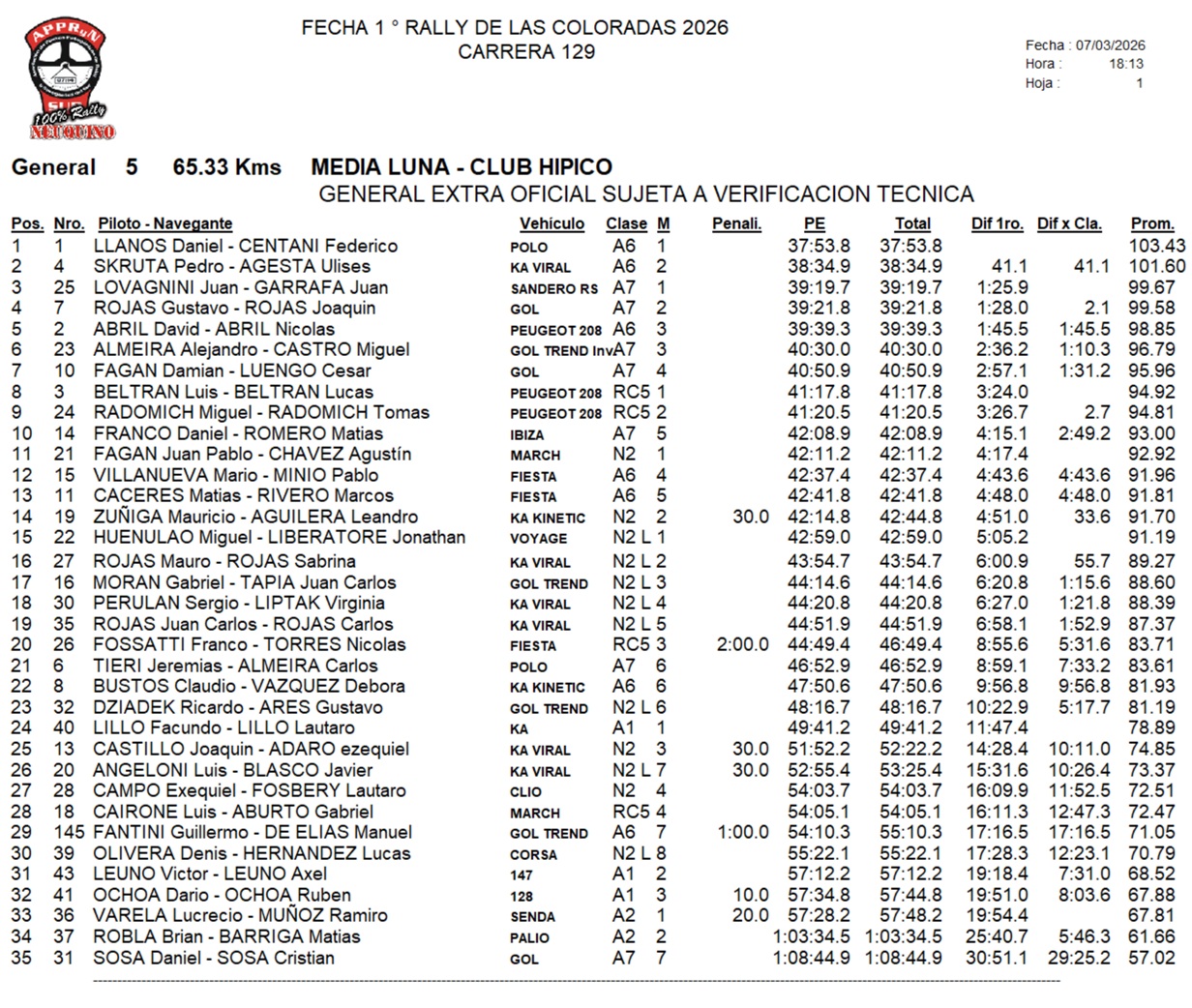 Con un tiempo de 37m53s8, Daniel Llanos – Federico Centani se quedaron con la primera etapa del rally de Las Coloradas. Pedro Skruta – Ulises Agesta los escoltan a 41s1. Terceros en la general -y primeros en la A7- están Juan Lovagnini – Juan Garrafa. Más atrás se encolumnan Gustavo Rojas, David Abril, Alejandro Almeira, Damián Fagán, Luis Beltrán, Miguel Radomich y Daniel Franco. Mañana la actividad comienza a las 9.08 hs.