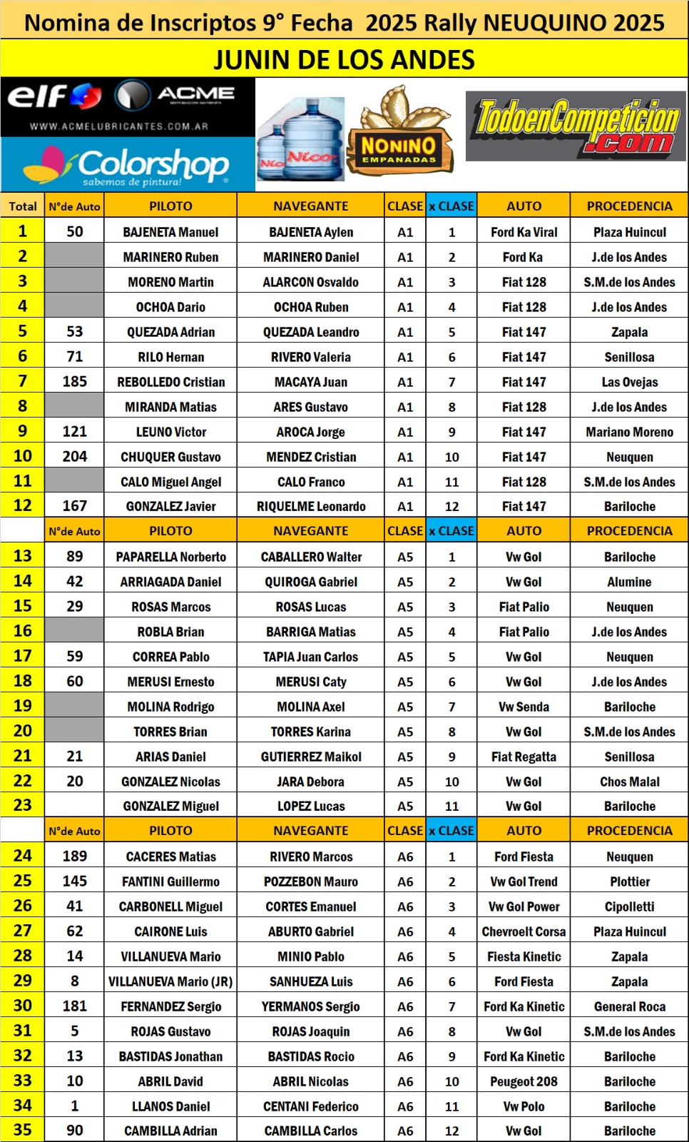 Durante la tarde del martes cerraron las inscripciones para el rally de Junín de los Andes, correspondiente a la novena fecha del certamen que organiza APPRyN Sur. Los 99 binomios inscriptos representan la cifra más elevada para la temporada 2025. La carrera tendrá lugar entre el viernes 21 y el domingo 23 de noviembre y otorgará puntaje doble.