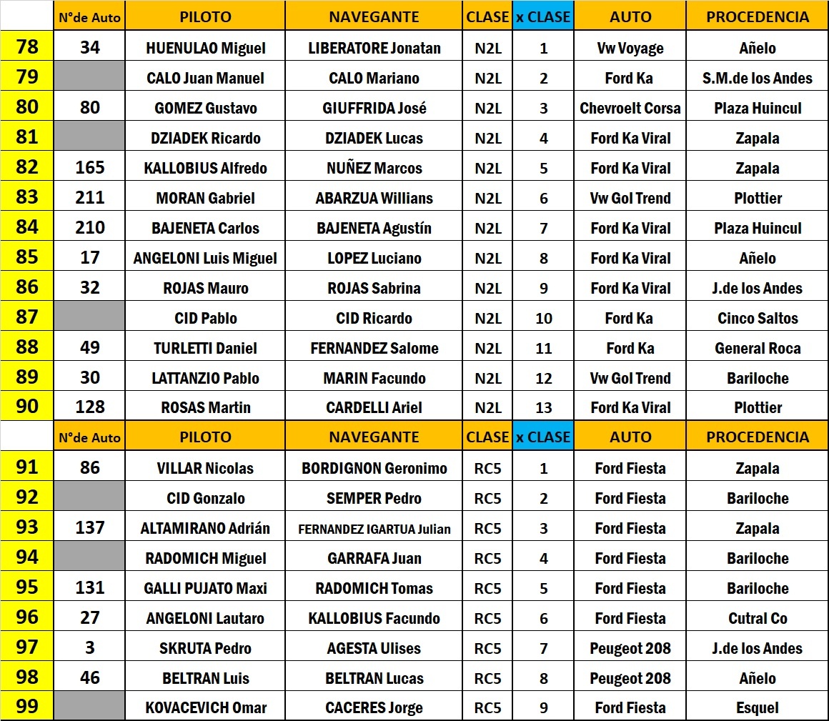 Ya en la N2L, Daniel Turletti buscará consolidarse en la punta. Le lleva 28 puntos a Miguel Huenulao y 29 a Mauro Rojas, que intentará hacer valer la localía. A ellos se suma el otro integrante de la Copa, Pablo Lattanzio. También estarán Juan Manuel Calo, Gustavo “Chinche” Gómez, Ricardo Dziadek, Alfredo Kallobius, Gabriel Morán, Carlos Bajeneta, Luis Miguel Angeloni, Pablo Cid y Martín Rosas.