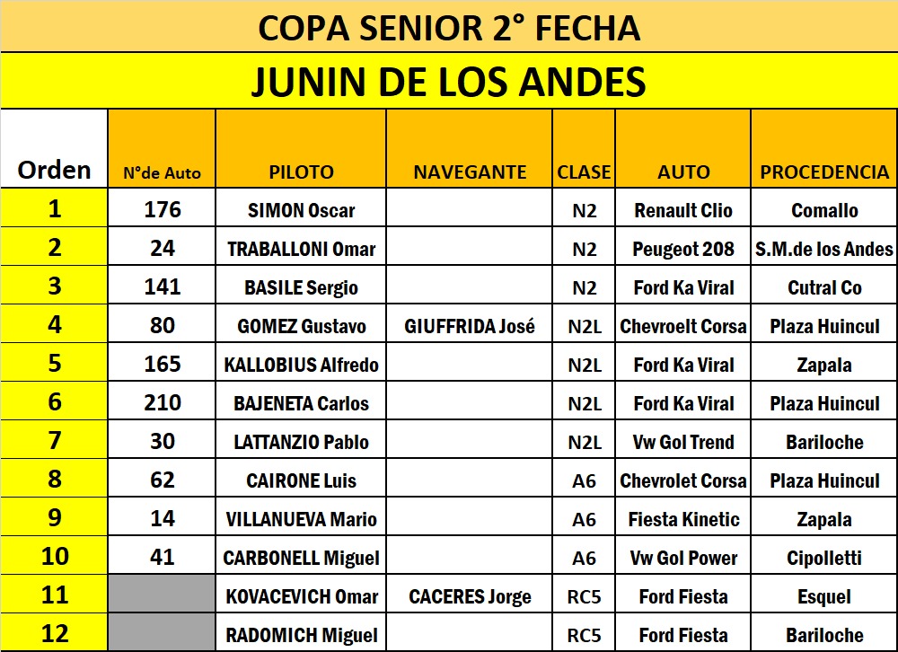 Por último, la Copa Senior tendrá 12 participantes. Los mismos son Oscar Simón, Omar Traballoni, Sergio Basile, Gustavo Gómez, Alfredo Kallobius, Carlos Bajeneta, Pablo Lattanzio, Luis Cairone, Mario Villanueva, Miguel Carbonell, Omar Kovacevich y Miguel Radomich. La primera fecha en Bajada del Agrio fue ganada por Miguel Carbonell.
