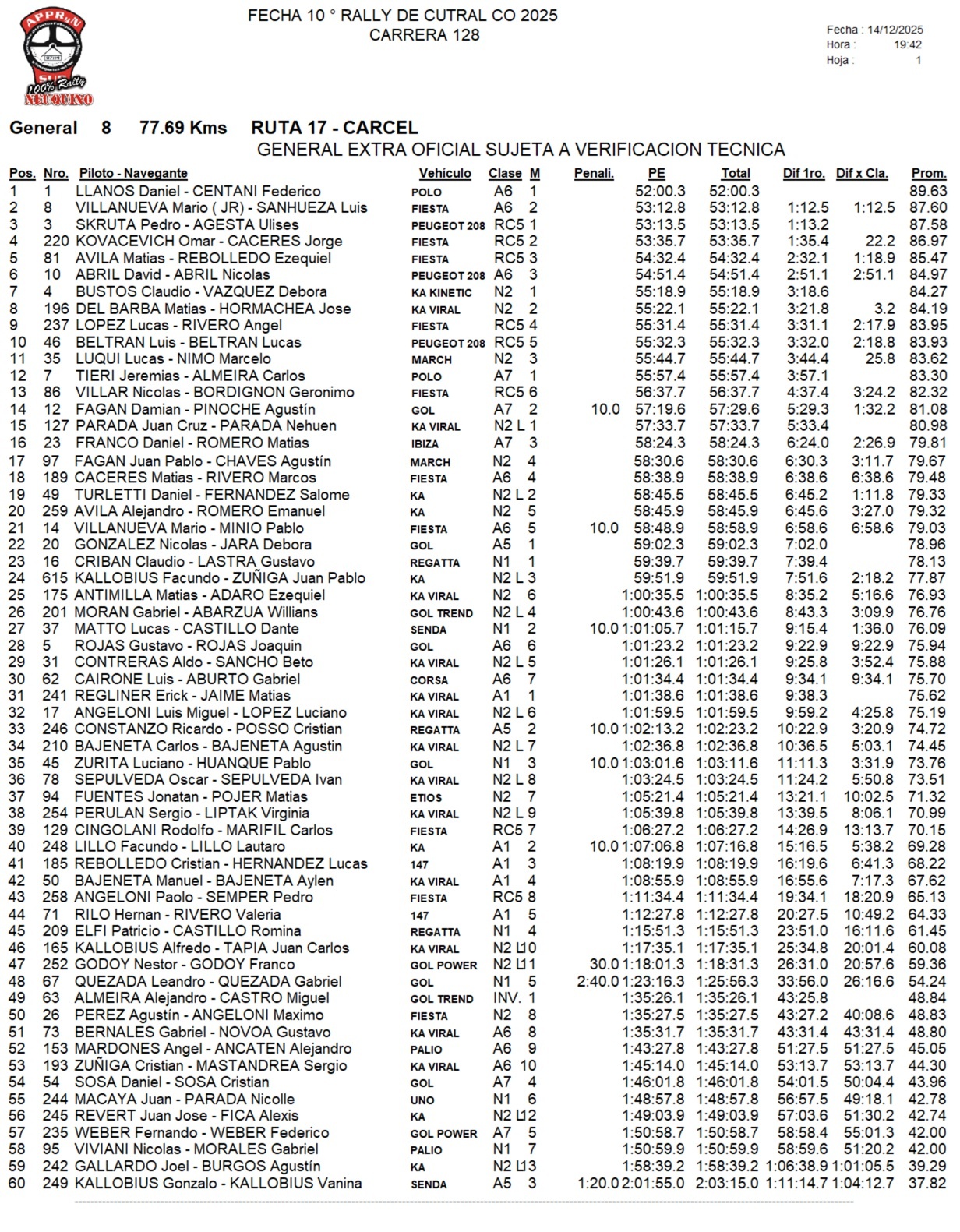 Con un tiempo de 52m00s3, Daniel Llanos se quedó con el triunfo en la general y la A6, con 1m12s5 de ventaja sobre Mario Villanueva (h). Tercero en la general quedó Pedro Skruta, que ganó la RC5, a 1m13s2 de Llanos. Completaron los diez primeros de la general: Omar Kovacevich, Matías Ávila, David Abril, Claudio Bustos (ganó la N2), Matías del Barba, Lucas López y Luis Beltrán.